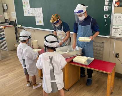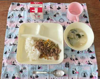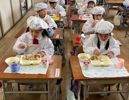 1年生の給食時間です。今日のメニューは、ビビンバ、トック、牛乳です。ビビンバの名前は「まぜる」という意味の「ピビム」と「ごはん」という意味の「パプ」を合わせた「ピビムパプ」からきているそうです。今日もみんなおいしい顔でもりもり食べています。