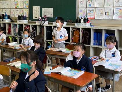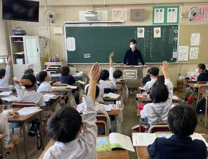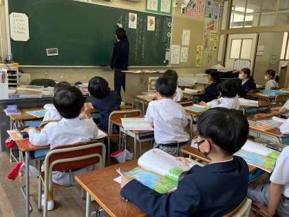 2年生の道徳の時間です。おのを池に落としてしまった正直なきこりと神さまとのやりとりのお話です。しっかりと手をあげて発言できていました。