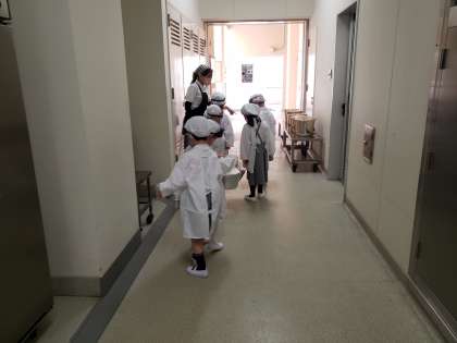 先週まで、6年生と先生で給食をもっていっていましたが、今週から1年生も軽いものだけ自分たちで持っていきます。