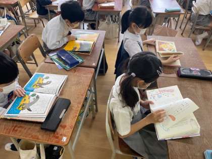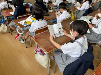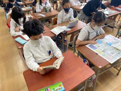 3年生の教室です。静かな朝の雰囲気の中、読書を楽しんでいます。新聞を読んでいる子もいますね。
