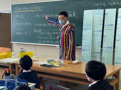 3年生の図画工作の時間です。今年度は、教務主任の新井先生が3年生の図画工作を担当します。初めの授業は「このかたちなあんだ」です。