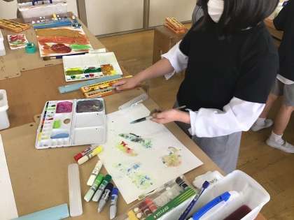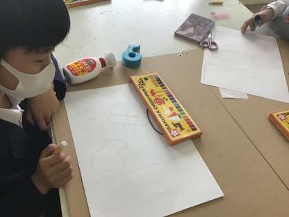 身近な文房具の形を白色パスで写しとったあと、絵の具で思い思いの色を選んで彩色していきます。