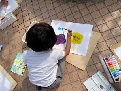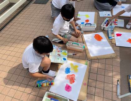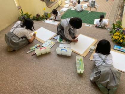4年生の図画工作の時間です。この日はいいお天気だったので、外で絵を描きました。