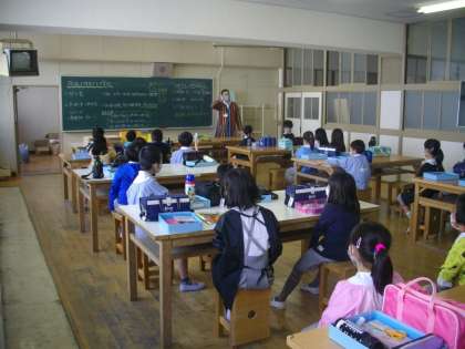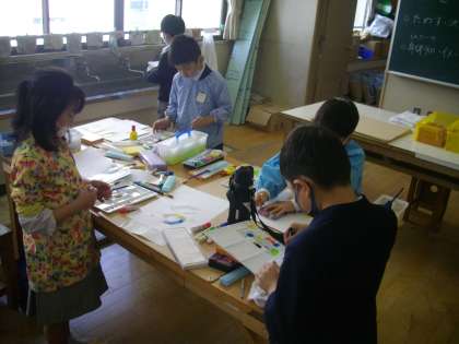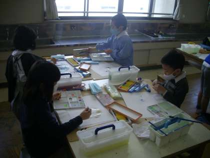 3年生の図画工作の時間です。「このかたちなあんだ」の学習をしています。このクラスでも、子どもたちが自分の思いにあった色を選んでていねいに塗っていきました。どんな作品に仕あがるか、楽しみですね。