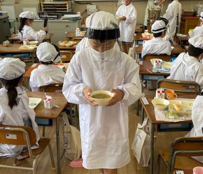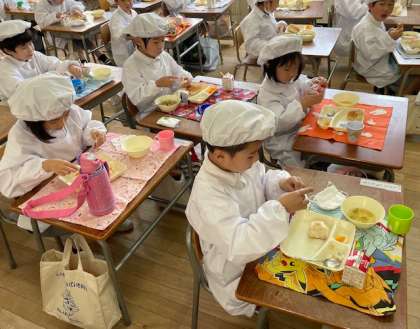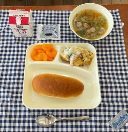 1年生の給食時間です。今日のメニューは、マカロニグラタン、レタスのスープ、みかん(かんづめ)、コッペパン、ブルーベリージャム、牛乳です。