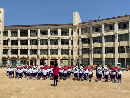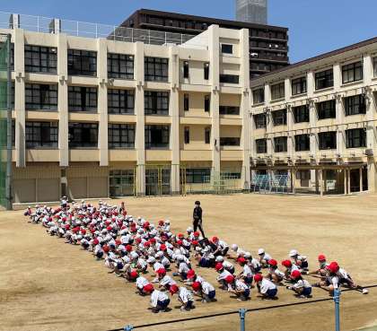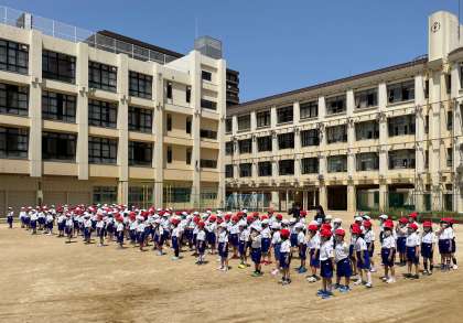1年生が初めて5クラス一緒に集まって、合同体育をおこないました。まずは、運動場に整列したあと、準備運動をしました。