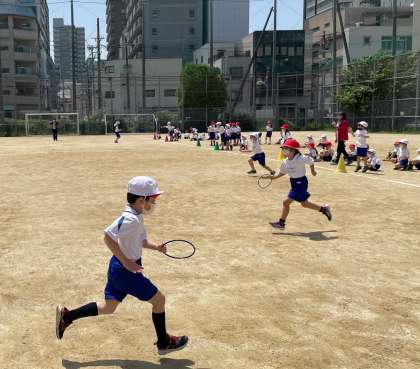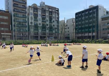 次に、広いグラウンドに移動して、かけっこ遊びをしました。いいお天気のもと、みんな思う存分駆けまわりました。