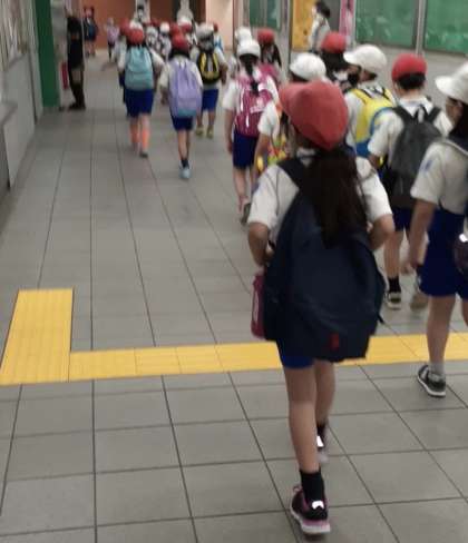 たくさん活動した鶴見緑地公園をあとにし、地下鉄に乗って松屋町駅に着きました。学校到着まであともう少しです。楽しい遠足でしたね。