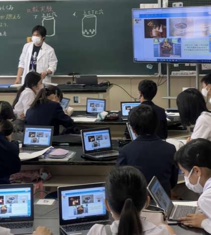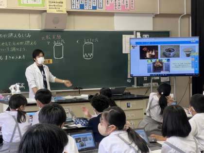 6年生の理科の時間です。理科室で「ものが燃えるしくみ」を学習しています。さすが6年生、一人一台学習者用端末を自在に操っています。