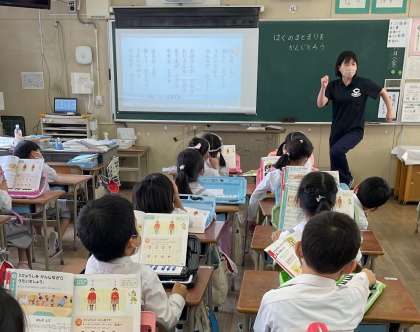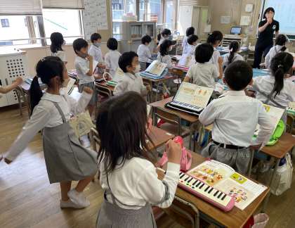 楽器を弾いたり、歌ったり、動作化をしたりして、二拍子のリズムを全身で楽しんでいます。