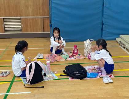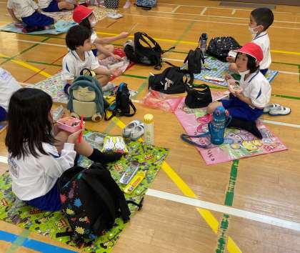 遠足が延期になった2年生が学校でおべんとうを食べました。
