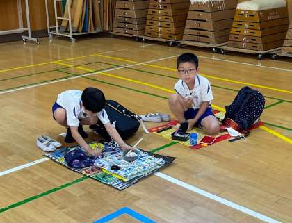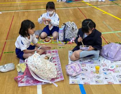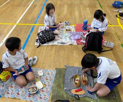 体育館にシートを広げ、少しだけ遠足気分でおいしいおべんとうをいただきました。