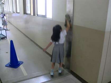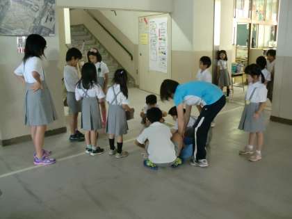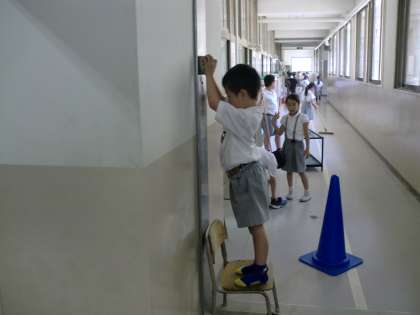 先生からぞうきんの絞り方を教わり、がんばって拭き掃除!