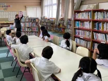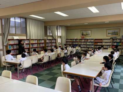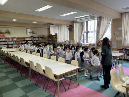 1年生の国語の時間です。今日は初めて図書室に来ました。先生から、図書室の本の並び方や使い方のきまりなどの説明がありました。みんなとてもしっかり聞いています。