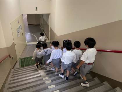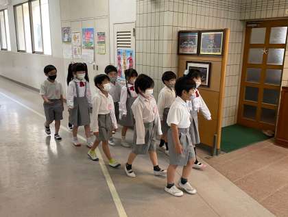 1年生が視力検査をおこないました。保健室に行く時は、グループごとに自分たちだけできちんと並んで歩いて行きます。