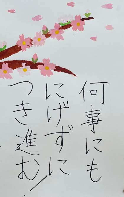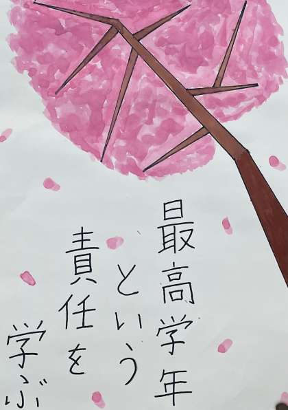桜の花を描き、6年生としての決意の言葉を添えました。