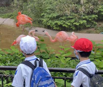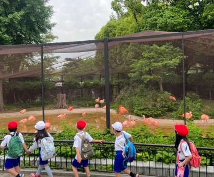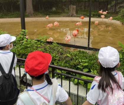 まず初めに見たのは、フラミンゴです。あざやかな色に子どもたちの視線は釘付けです。