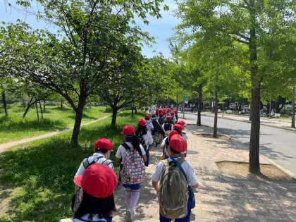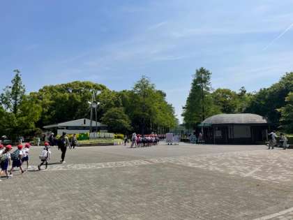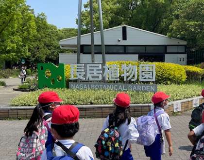 青空と緑がまぶしい公園の中を歩いていくと、やがて長居植物園の看板が見えてきました。
