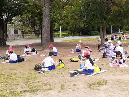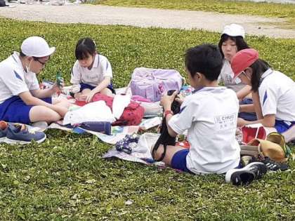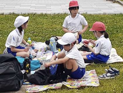 オリエンテーリングのあとは、楽しいお弁当タイム。自然の中で食べると、一段とおいしく感じられますね。