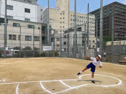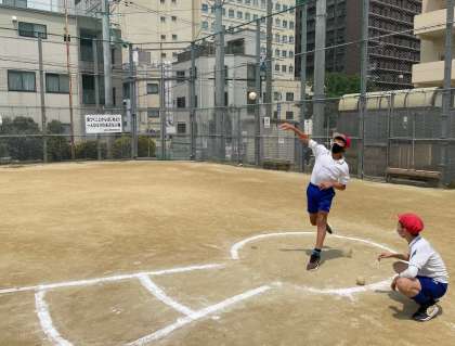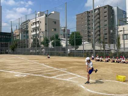 別のエリアでは、ソフトボール投げをおこないました。力強い投球です。
