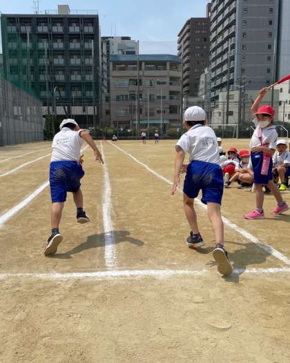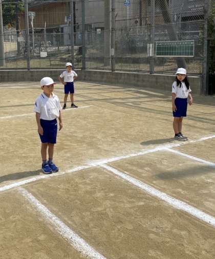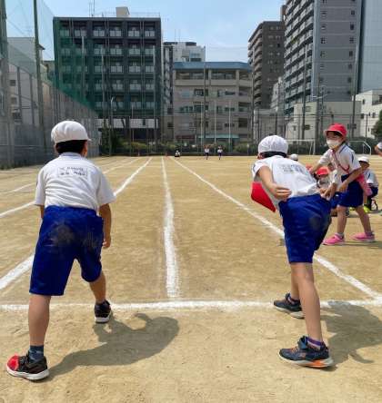 くっきりと引き直された白線を前に、50m走のスタートに向けて緊張感が高まります。
