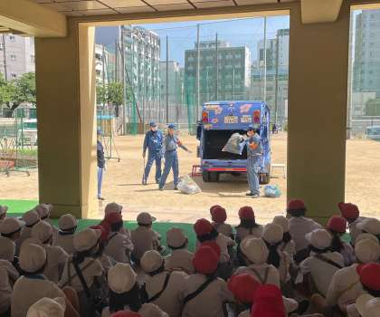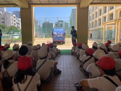 大阪市環境局の方に来ていただき、4年生がパッカー車の学習をおこないました。