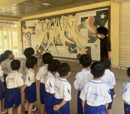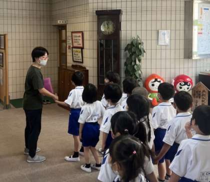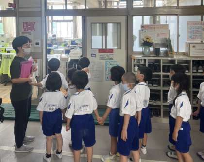1年生が学校のいろいろな場所を巡る「がっこうたんけん」をおこないました。まずは、職員室、校長室、ピロティです。