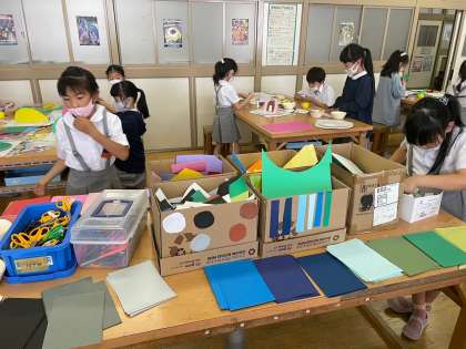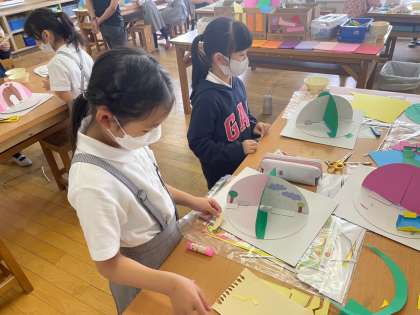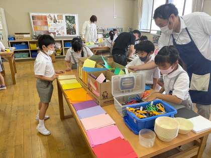 自分の思い描く動きに合う色や形を見つけて、工夫して「くるくるランド」をつくる子どもたちの様子を見ながら、その意欲的な姿に感心しておられました。