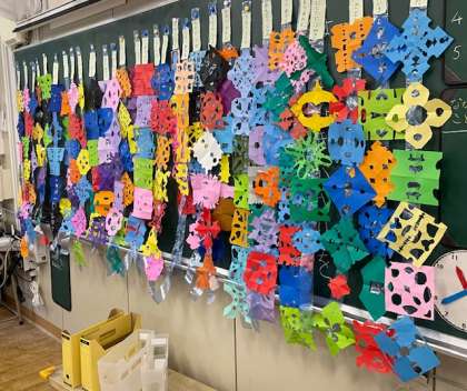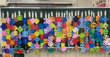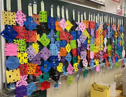 テープの端まで貼り終えると、すてきな飾りの完成です。クラスみんなの作品を黒板につるすと、このように壮観です。