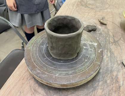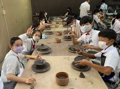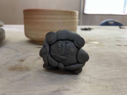 完成した作品を前にカシャッ。中には玄人はだしの作品をつくる子もいてびっくり。余った土でたぬきのキャラクターをつくるユニークな子もいました。