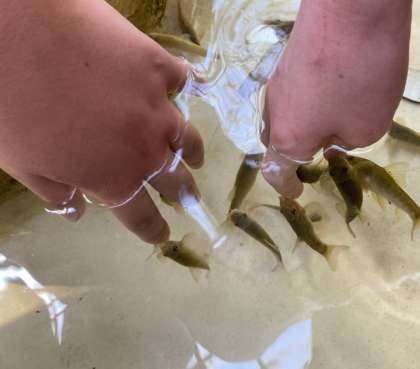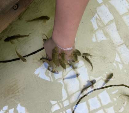 ある子が手を水槽に差し入れると、ドクターフィッシュが集まってきました。