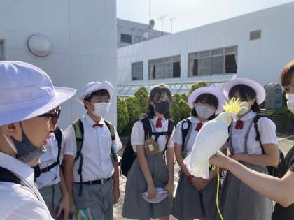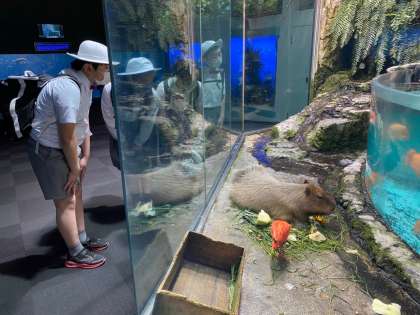 カピバラです。その手前にいるオレンジの鳥は、ショウジョウトキです。また、白いオウムもいます。珍しい鳥もいる水族館です。