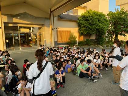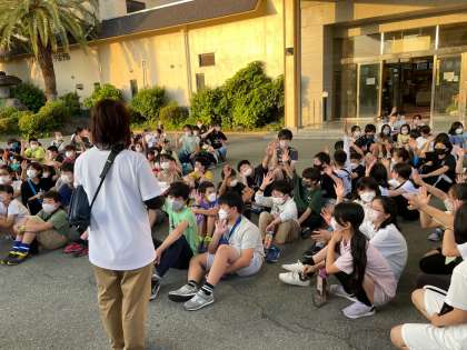 部屋割りをしたあと、避難経路の確認と避難訓練をおこないました。