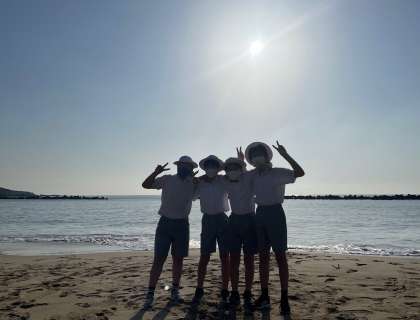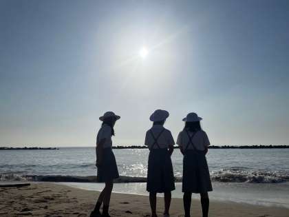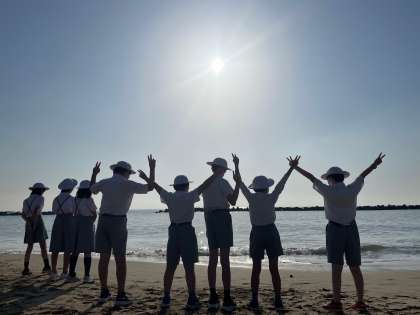 体操のあとは浜辺の散歩です。朝日をバックに子どもたちのシルエットが浮かびます。