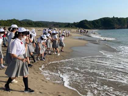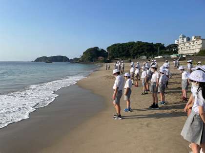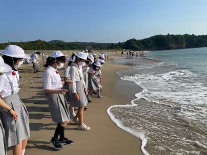 波打ち際まできました。濡れないように恐る恐る近づいていきます。