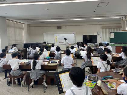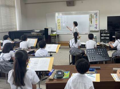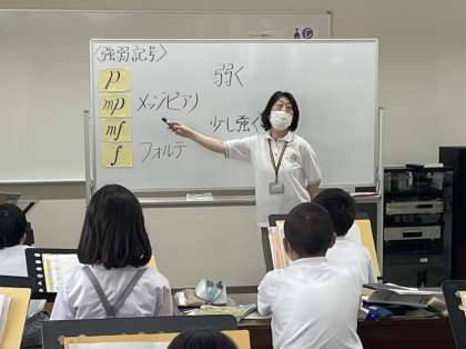 4年生の音楽の時間です。強弱記号の学習をしています。ピアノ・メッゾ ピアノ・メッゾ フォルテ・フォルテ… ホワイトボードに書かれた文字が少しずつ消されていきますが、子どもたちはしっかり覚えています。
