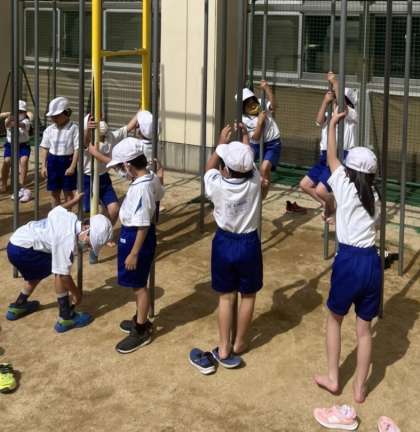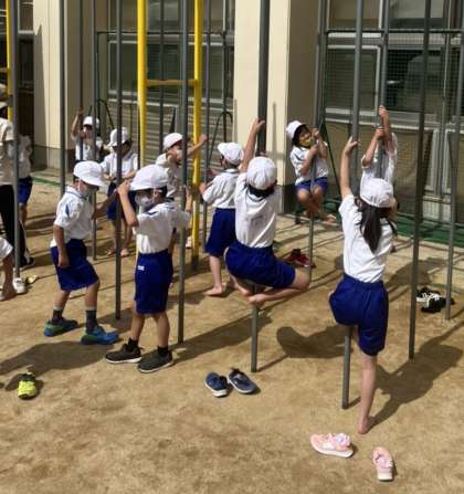 1年生の体育の時間です。足もしっかり使ってのぼりぼうを登るために、はだしでチャレンジしていました!
