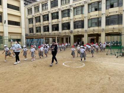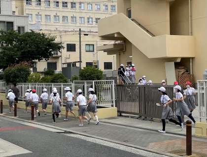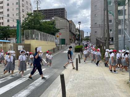 今日は火災が起こった際の避難訓練をおこないました。理科室から出火したと想定して、理科室から離れた階段や通路、出口を使って、瓦屋町グラウンドに移動しました。