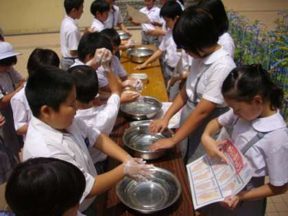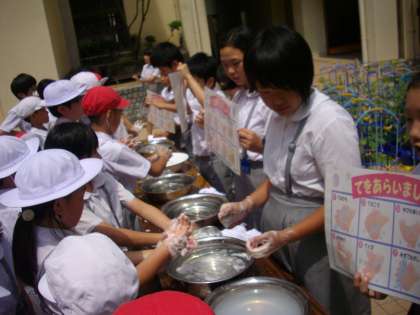 また、その隣では正しい手洗いの方法を教え、実際に手を洗ってもらいました。