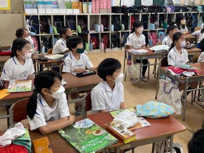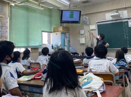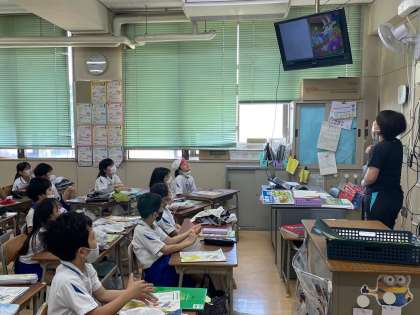 3年生の教室です。朝の英語モジュール学習をおこなっています。動画に出てくるスペルに合わせて、正確に発音できるよう心がけています。