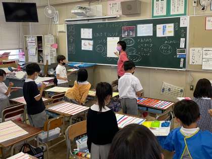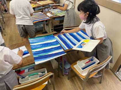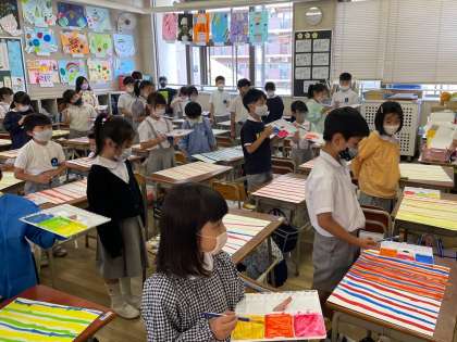 2年生の図画工作の時間です。初めて絵の具を使うにあたって、しましまTシャツを描きます。