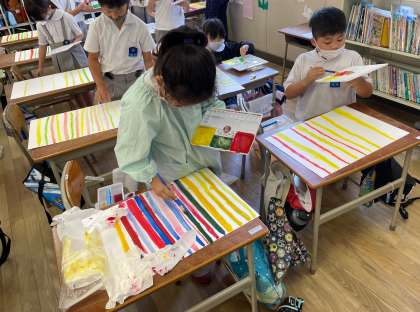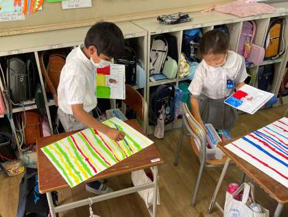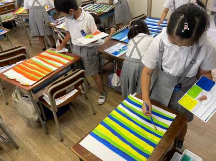 水加減に気をつけながら、好きな色を使ってしましま模様を描いていきます。どんなTシャツができあがるか楽しみです。