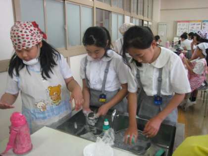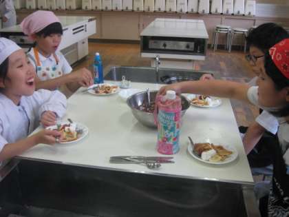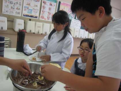 今回は、チョコレートフォンデュを作りました。チョコレートを湯せんで溶かして、材料を切ったり分けたりと、役割分担をして楽しく作ることができました。出来上がると、バナナ、ぶどう、マシュマロ、クッキーにたっぷりチョコレートをつけて食べました。どの班も、チョコレートをきれいに全て食べ、「おいしかったー!」と満足そうでした。