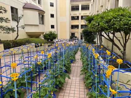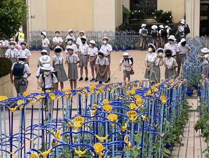 1年生が大切に育てているあさがおがずいぶん大きくなりました。その向こうには、あいさつ週間でがんばっている児童会の子どもたちの姿が見えます。あさがおに負けないぐらい子どもたちも日々成長しています。