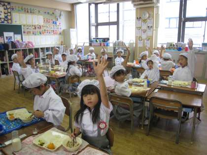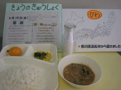 今日のメニューは「マーボーはるさめ(年1回)、チンゲンサイとコーンの甘酢あえ、びわ(年1回)、ごはん、牛乳」でした。びわは中国生まれで、中国では1500年前から、日本では1000年前から食べられている歴史のある果物です。中華料理でトウバンジャンの味が決めてである「マーボーはるさめ」に、中国野菜である「チンゲンサイ」を使った甘酢あえ、中国生まれのびわという”中国づくし”の味を賞味し、子どもたちはニコニコ顔でした。ちなみに、初めてびわを食べた1年生児童は63%(92人)もいました。食育の日(毎月19日)にふさわしい体験となりました。