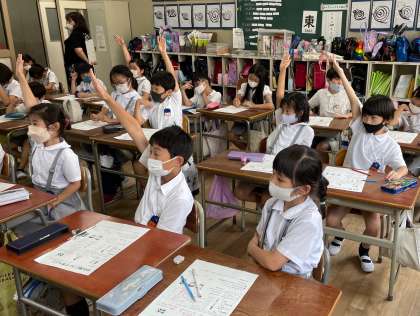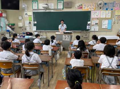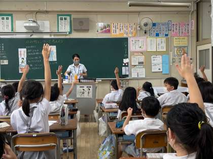 3年生の教室です。暑くなる日が多くなってきたことを踏まえて、栄養教諭の先生と一緒に飲み物について考える学習をおこないました。