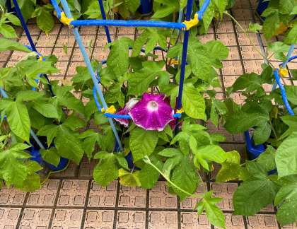 1年生が大切に育てているあさがおの花が咲き始めました。昨日からの雨で、雨粒が輝いています。このあと雨もやみそうです。今日も一日がんばりましょう!