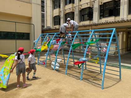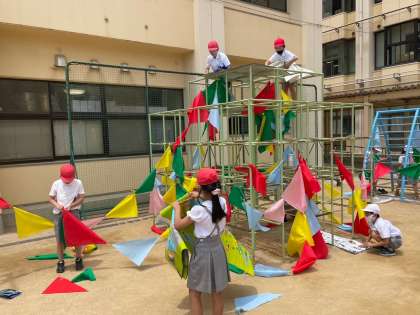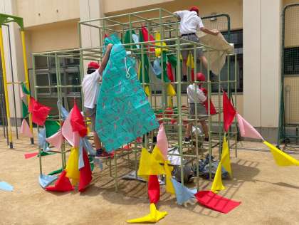 フックを使って布を遊具にかけたり、布どうしを長くつないでフラッグのようにしたり、それぞれの子がそれぞれの自由な発想・構想で活動を進めていきます。