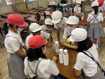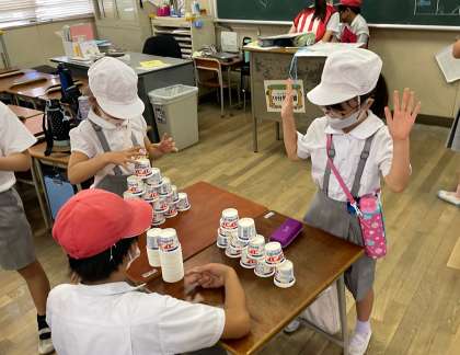 「紙コップつみ」コーナーです。制限時間内に紙コップを高く多く積んでいきます。途中でくずれてしまってもあきらめずにやり直します。