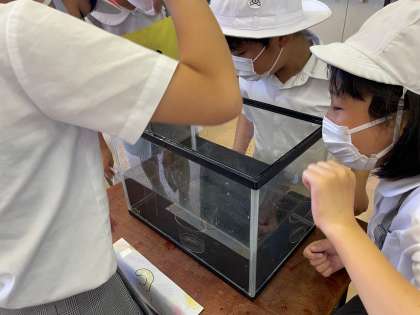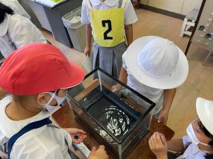 「コイン落とし」コーナーです。水槽の中にあるカップをめがけてコインを落として入れていきます。的が水の中なのでなかなかむずかしいようです。
